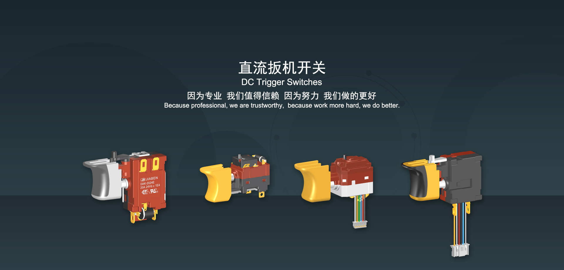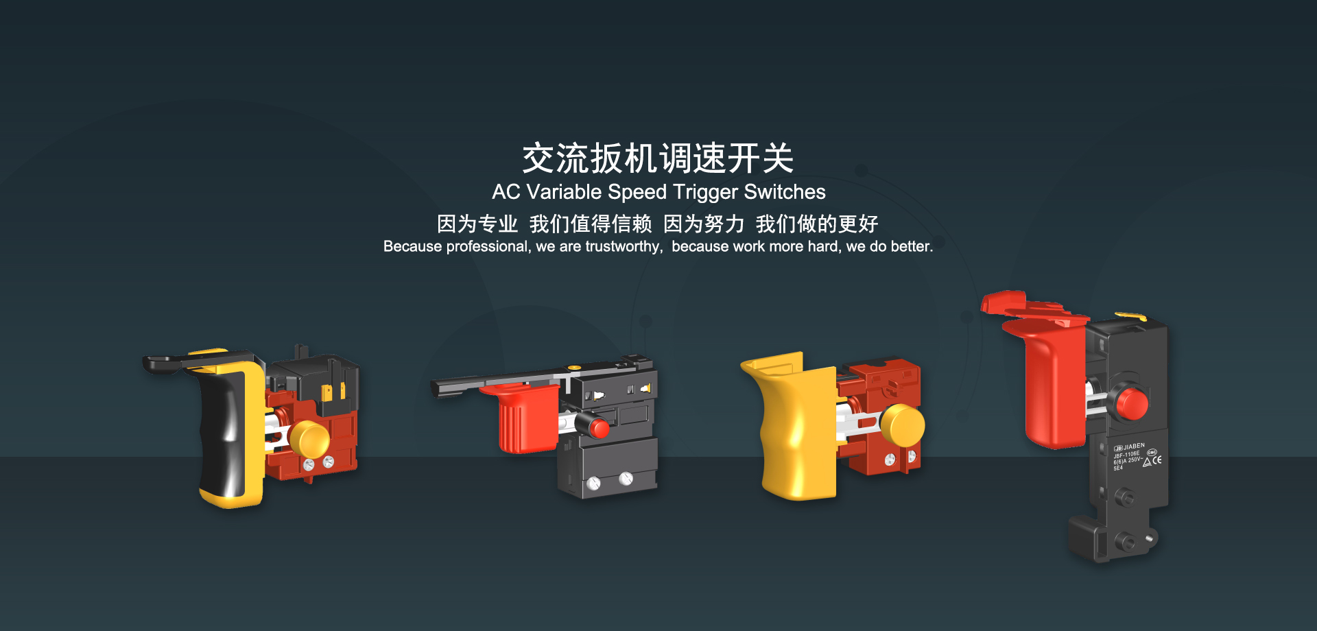 浙江佳奔電子有限公司始建于1986年,坐落于浙江省樂清市虹橋鎮(zhèn)東電子信息產(chǎn)業(yè)園內(nèi),現(xiàn)有職工700多人,資產(chǎn)總額超3億元。公司主要經(jīng)營“JIABEN”牌微動開關(guān)、蹺板開關(guān)、按鈕開關(guān)、扳機(jī)開關(guān)、調(diào)速開關(guān)和電位器開關(guān)等各類交、直流器具開關(guān)和各類交、直流線路板模塊等產(chǎn)品,主要應(yīng)用于交、直流電動工具、電動園林工具、清潔器具、家用電器和小型機(jī)床等行業(yè),是集產(chǎn)品設(shè)計、研發(fā)、制造、銷售和服務(wù)于一體的國家高新技術(shù)企業(yè)。JIABEN was founded in 1986, located in East Electronic Information Industry Park, Hongqiao Town, Yueqing City, Zhejiang Proviance, existing staff more than 700 peoples, more than 300 million RMB worth of assets. Company is mainly engaged in "JIABEN" brand Micro Switch, Rocker Switch, Push-button Switch, Trigger Switch, Speed Regulating Switch, Potentiometer Switch and other kinds of appliance switch and all kinds of AC or DC circuit board module, such as more than 100 series, 8000 kinds of models of products, mainly used in AC or DC Power-tools, Power Gardening Tools, Cleaning Appliances, Household Appliances and Small Machine Tool and other industries, is the collection product design, research and development, manufacturing, sales and service in one of the national high and new technology enterprise.